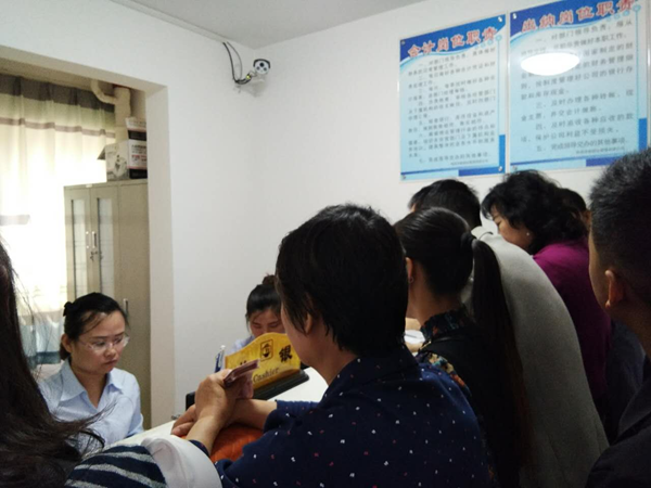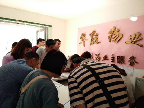 經(jīng)過各部門領(lǐng)導(dǎo)的精心帶領(lǐng)下及各單位同事的幫忙努力下一天的工作終于落幕,順利收房82戶。(圖為前臺收房及收費(fèi)室) 石婷