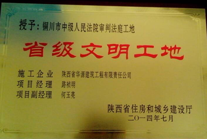 在公司領(lǐng)導(dǎo)層的指導(dǎo)下及項目部各人員的努力工作下,秉承務(wù)實求真高效的原則,由我公司承建的銅川市中級人民法院審判法庭工地被評為省級文明工地,榮獲省級文明工地榮譽證書。該項目由銅川市中級人民法院投資建設(shè),由陜西建新項目管理咨詢有限公司負責(zé)監(jiān)理,由陜西省華源建筑工程有限責(zé)任公司承建。